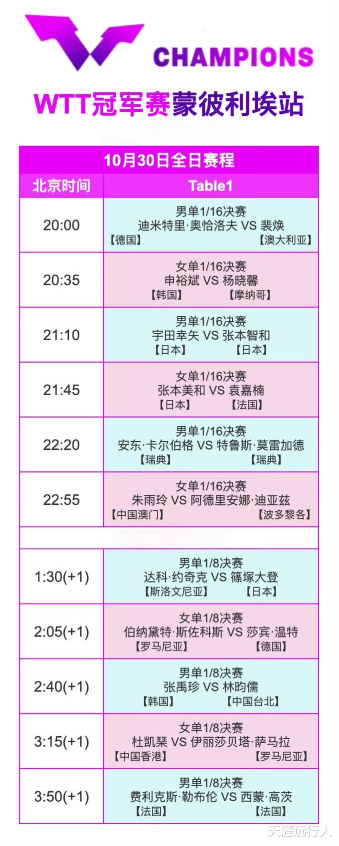 这个比赛日,将进行首轮男女单打剩下的各三场和第二轮1/8决赛的五场,共11场角逐,仅剩女单两人的国乒,这个比赛日没有球员出战。